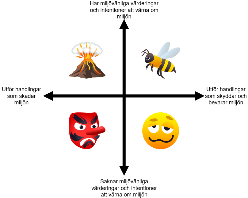 Personer i 🐝-gruppen är de som värnar om miljön inte bara i tanken utan också i handling. 🌋-gruppen är de personer som, likt en vulkan, känner sig engagerade i miljöfrågan och vill väl men som ibland blir lite överexalterade och får ett utbrott och rätt som det är så förgiftar de planeten med ett tjockt askmoln (bildligt talat). I nedre vänstra kvadranten finner vi goblin-gruppen (👺), den här gruppen innefattar regnskogsskövlare och personer som slänger sitt skräp från McDonald’s ut genom bilrutan ner i vägrenen. Den sista gruppen (🥴) vet jag inte om den finns på riktigt eftersom det krävs en särskild sorts inkompetens att utföra handlingar som skyddar och bevara miljön fastän man inte bryr sig om den.